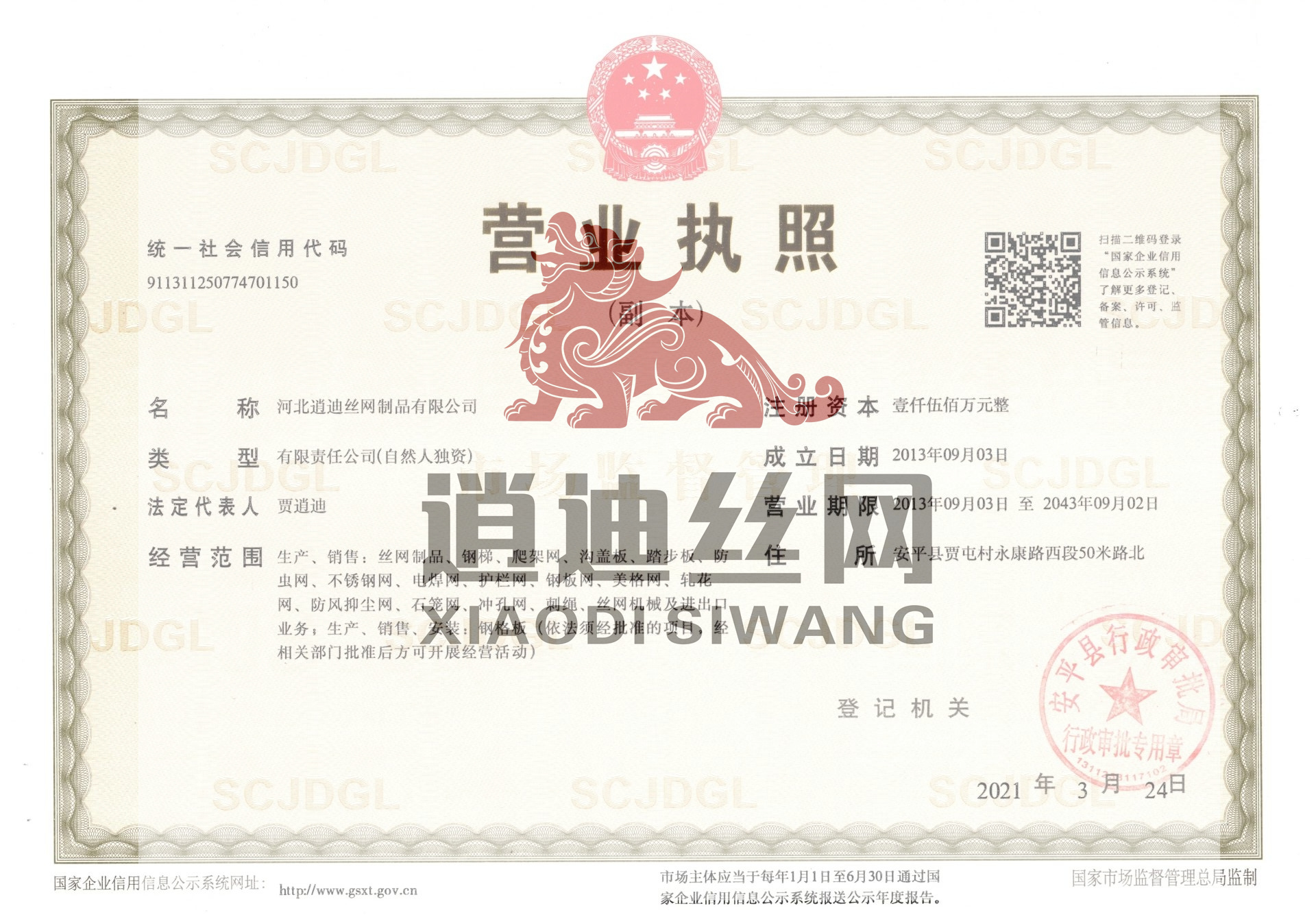 河北逍迪絲網(wǎng)制品有限公司誠(chéng)信天下,誠(chéng)信是我們公司一個(gè)原則問(wèn)題不可撼動(dòng)的,以心中有誠(chéng)信的思想結(jié)交五湖四海的朋友,能達(dá)到雙贏是最好的,我們堅(jiān)信朋友多了路好走,我們公司都是老朋友多,我們一直是這樣做的。河北逍迪絲網(wǎng)制品有限公司成立于2013年注冊(cè)資本壹仟伍佰萬(wàn)整,主要生產(chǎn)沖孔網(wǎng),鋼格板,金屬防蟲(chóng)網(wǎng),如實(shí)的實(shí)體廠家,是一家-研發(fā)-銷售-生產(chǎn)-安裝-售后一條龍公司,2019年通過(guò)了ISO 9001認(rèn)證管理體系符合GB/T 19001-2016/ISO 9001:2015標(biāo)準(zhǔn),同時(shí)通過(guò)了SGS認(rèn)證,擁有商標(biāo)版權(quán)2品牌,擁有一個(gè)著作版權(quán),河北逍迪絲網(wǎng)制品有限公司位于中國(guó)有名的(絲網(wǎng)之鄉(xiāng))安平縣,于天津,北京,雄安,石家莊相鄰,交通非常發(fā)達(dá),出口可以選擇天津港口非常近每天都有接貨送貨往返車輛,空運(yùn)可以選擇石家莊正定機(jī)場(chǎng),附近也有鐵路運(yùn)輸,當(dāng)?shù)剡€有兩個(gè)生態(tài)物流園區(qū)發(fā)往全國(guó)各地,我們沖孔網(wǎng)工廠生產(chǎn)設(shè)備有:普通沖壓機(jī),高速?zèng)_壓機(jī),自主研發(fā)小微孔沖壓機(jī),龍門(mén)沖,磚塔沖孔,重型沖孔機(jī),萬(wàn)瓦級(jí)別激光切割機(jī),3000W激光切割機(jī),焊接設(shè)備,折彎?rùn)C(jī),校平機(jī),剪板機(jī),精密校平機(jī),(對(duì)板面平整度要求苛刻的客戶群體0.5-0.2誤差)我們公司銷售市場(chǎng)沒(méi)有局限性國(guó)內(nèi)國(guó)外都供應(yīng),擁有出口權(quán)...